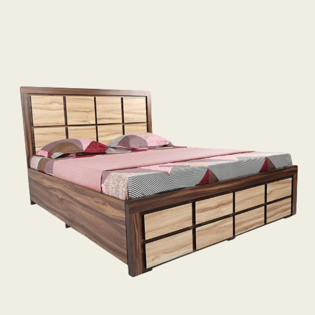 A dual-tone engineered wood queen size bed with block-style design and built-in storage boxes, combining modern aesthetics with practical functionality