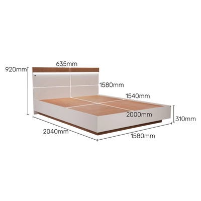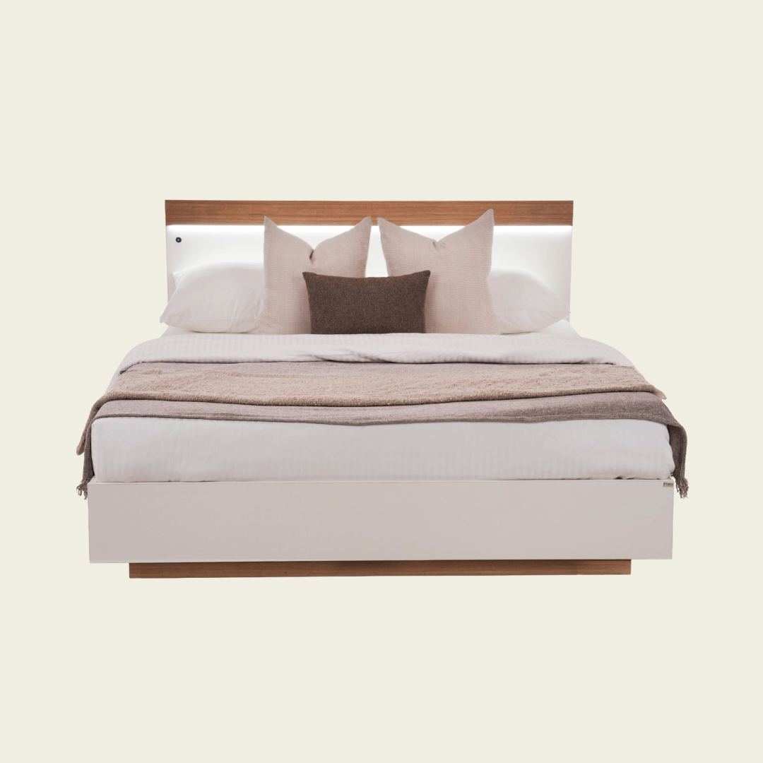 Part of the Juds Collection, this modern bed is masterfully crafted from pre-laminated engineered wood in an elegant frosty white and teak brown finish, offering a stylish and contemporary look for modern bedrooms. The bed features a sleek headboard with an integrated LED strip that creates a soft, relaxing atmosphere, perfect for winding down at the end of the day.