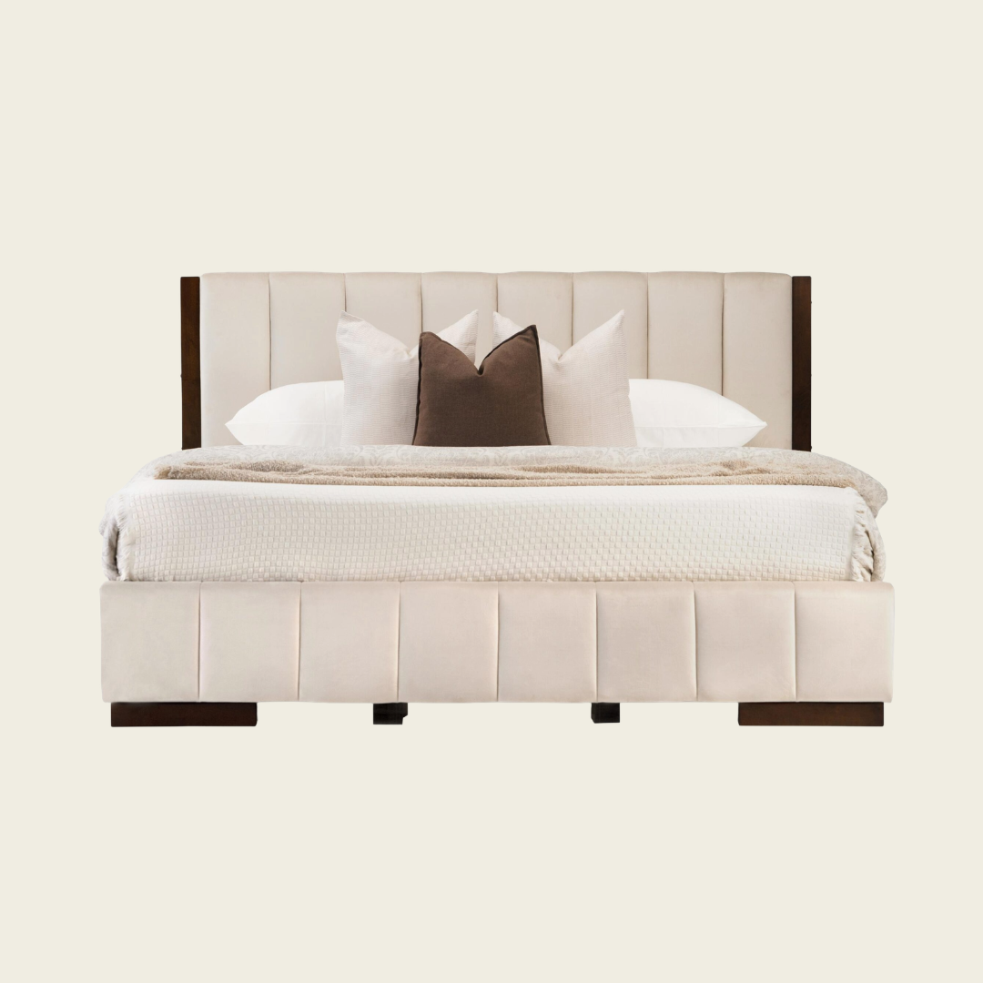 A luxurious velvet upholstered bed with a channel-tufted headboard, solid wood legs, and premium engineered wood frame, designed for elegant and comfortable modern bedrooms.