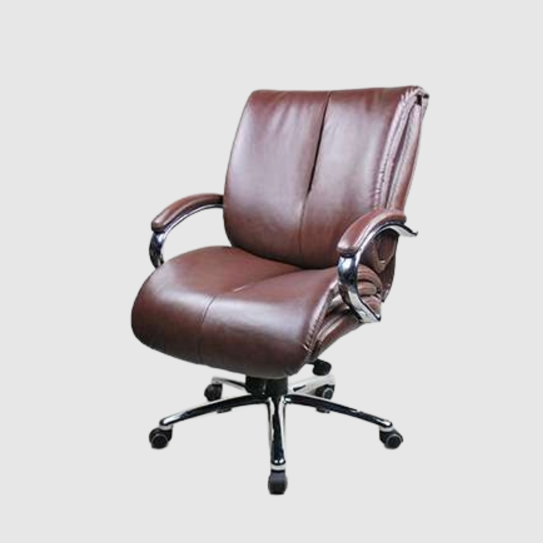 This executive office chair is designed to provide maximum comfort, durability, and a professional appearance for office and home workspaces. The chair features a generously padded seat and backrest that provide excellent support for the lower back and overall posture during long working hours. The stylish curved chrome armrests add both comfort and a modern executive look. The chair includes a height adjustment mechanism and a smooth 360-degree swivel base with durable rolling casters for easy movement around the workspace. With its sturdy construction and elegant design, this chair is ideal for executive offices, conference rooms, and home offices.