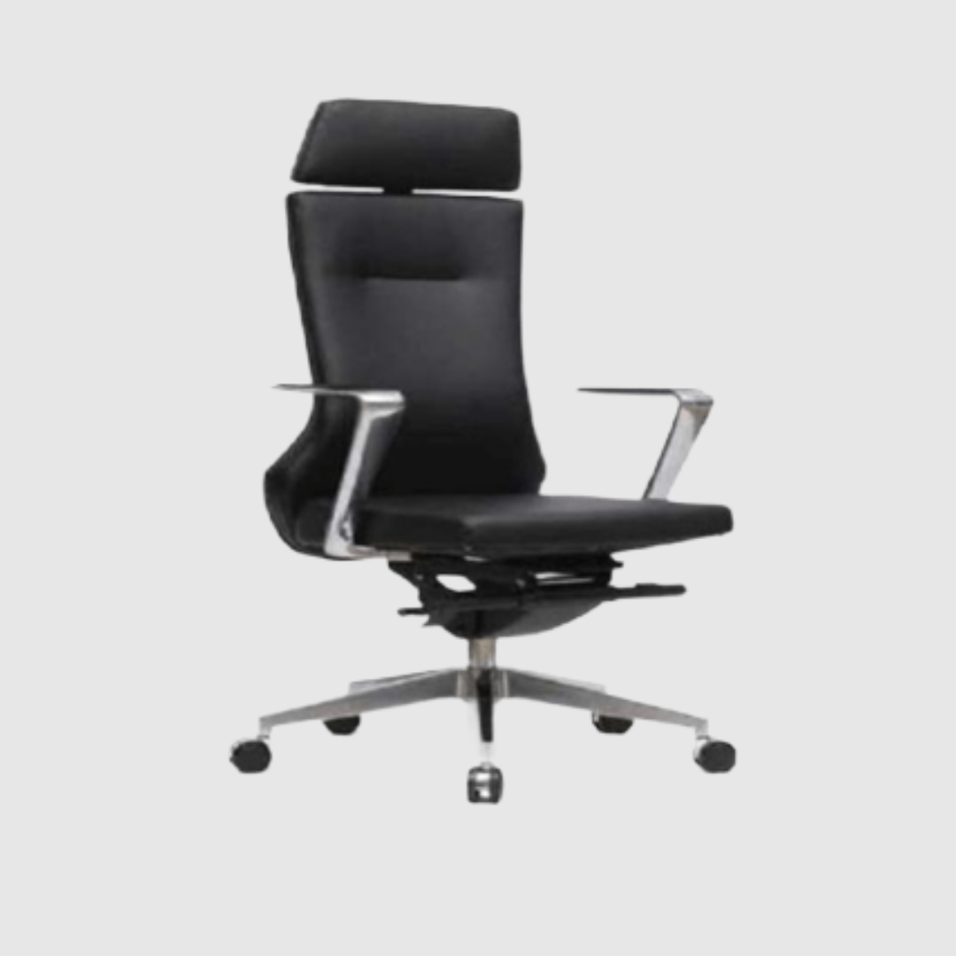 A modern high-back ergonomic office chair with headrest, sleek armrests, and a sturdy swivel base, designed for superior comfort and professional workspaces.