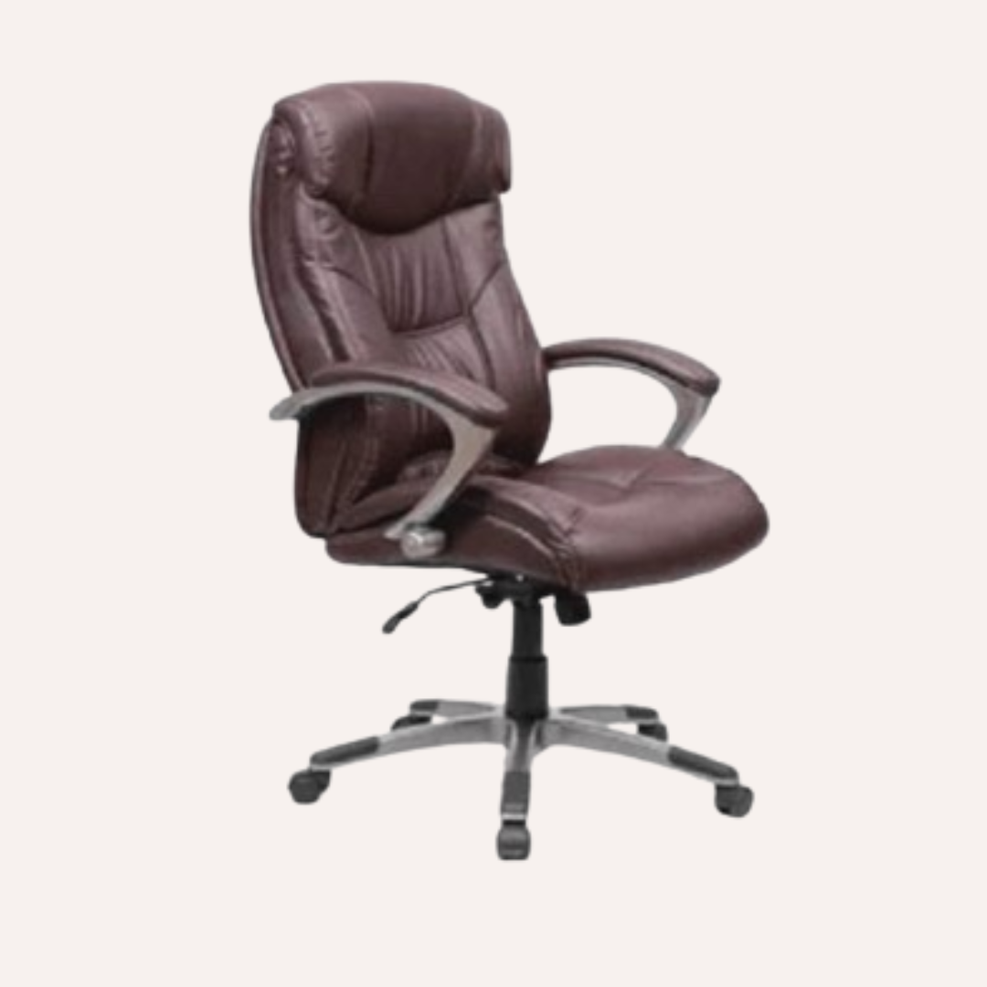Enhance your workspace with this sophisticated brown executive office chair, designed for both comfort and productivity. Featuring a high-back ergonomic design, it provides excellent support for your spine, neck, and shoulders during long working hours. The plush cushioning and soft upholstery ensure a comfortable seating experience, while the adjustable height and tilt mechanism allow you to customize your seating position. Equipped with smooth-rolling wheels and a sturdy base, this chair offers easy mobility and durability. Its elegant design adds a professional touch to any office or home workspace.