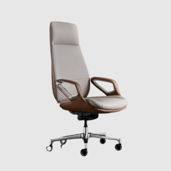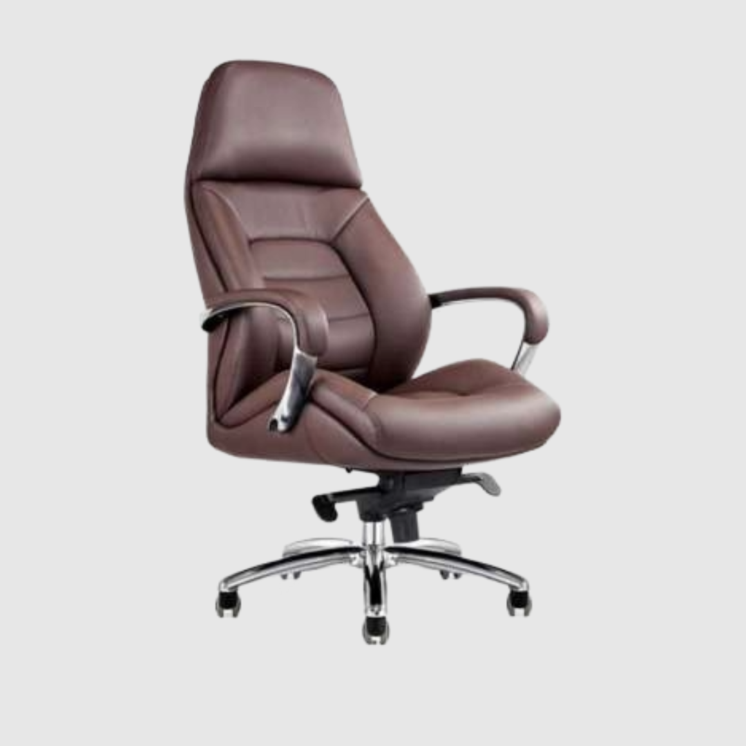 A premium high-back executive office chair with ergonomic cushioning, curved armrests, and a chrome swivel base, designed for comfort and professional office environments.