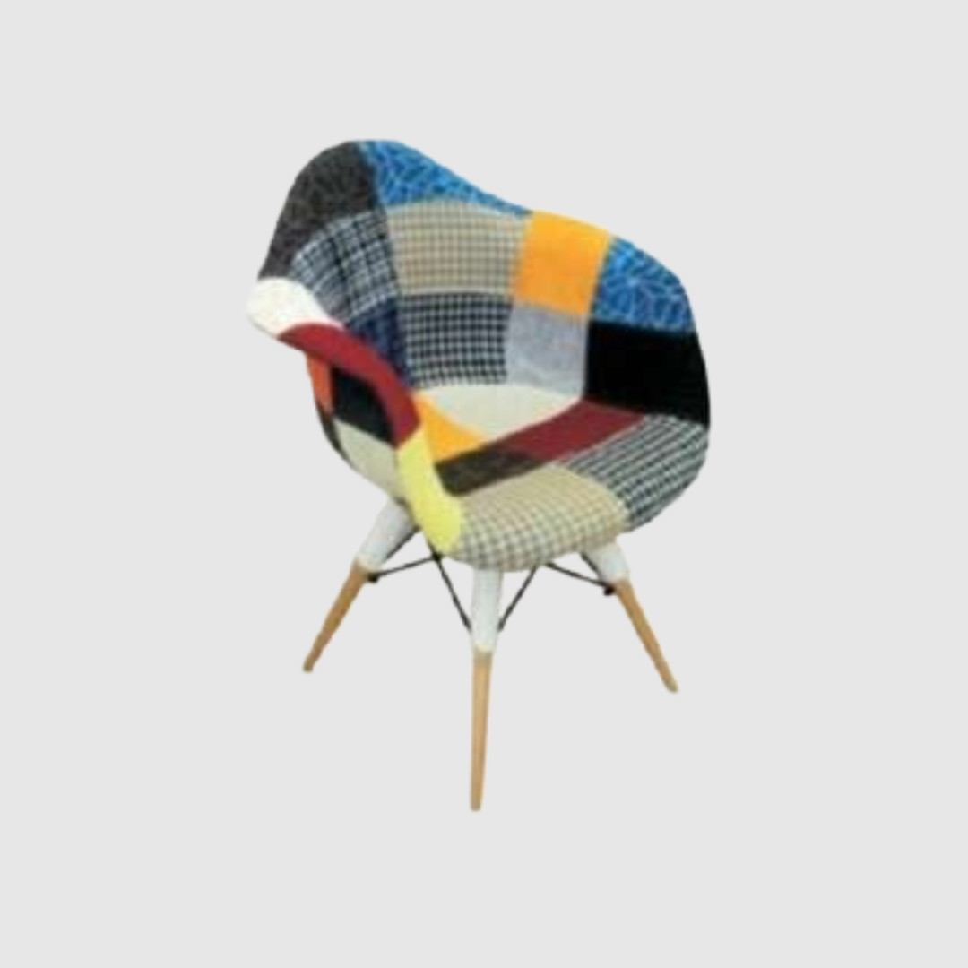 This contemporary patchwork armchair is designed to bring both comfort and personality into any interior. Featuring a vibrant multi-color fabric upholstery, the chair showcases a unique patchwork pattern that adds a bold and artistic touch to your space. The curved backrest and integrated armrests provide ergonomic support, ensuring a comfortable seating experience. Supported by sturdy wooden legs with reinforced metal cross supports, the chair offers excellent stability and durability. Ideal as an accent chair, it blends functionality with modern aesthetics, making it a standout piece for homes, offices, cafés, and boutique spaces.