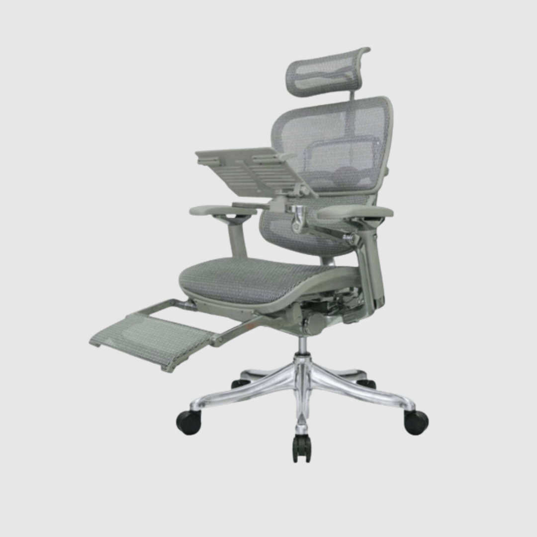 An ergonomic office chair with adjustable headrest, breathable mesh back, and an integrated footrest for enhanced comfort during long working hours.