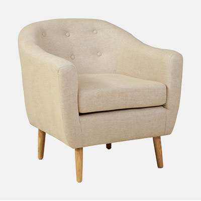 This elegant upholstered lounge chair combines comfort, durability, and modern design, making it a great addition to both residential and commercial spaces. The chair features a soft fabric upholstery with a button-tufted backrest that adds a classic and sophisticated look. The wide cushioned seat and curved armrests provide excellent comfort for relaxed seating. Supported by sturdy wooden legs, the chair offers stability and long-lasting durability. Its compact yet comfortable design makes it ideal for living rooms, bedrooms, office lounges, reception areas, and waiting rooms. The neutral fabric finish allows it to blend easily with various interior styles.